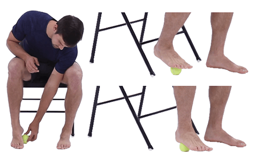Start by sitting upright in a chair. Place a tennis ball under the foot you want to work just in front of your heel. Slowly roll your foot back so the tennis ball rolls up towards your toes and then roll your foot forwards so the ball goes back towards your heel. Make sure to keep pressure on your foot with the ball throughout the movement. Hold for 30 seconds.